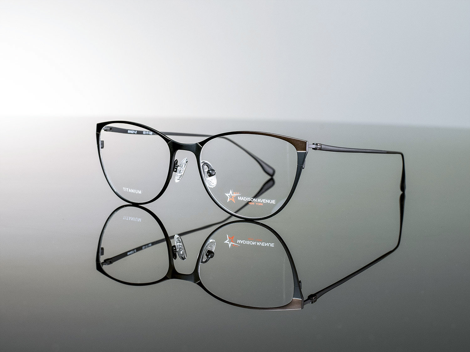 A lightweight titanium style, features double color front and temples.